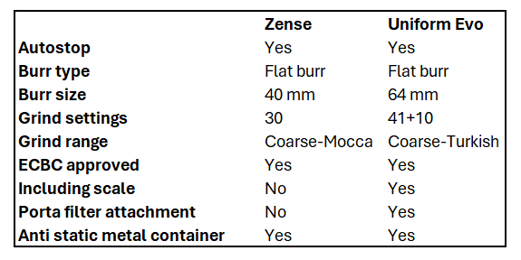 Die Zense Kaffeemühle verfügt über weniger Mahlgrade und mahlt nicht so fein wie die Uniform EVO, die auch für Espresso und türkischen Kaffee geeignet ist.