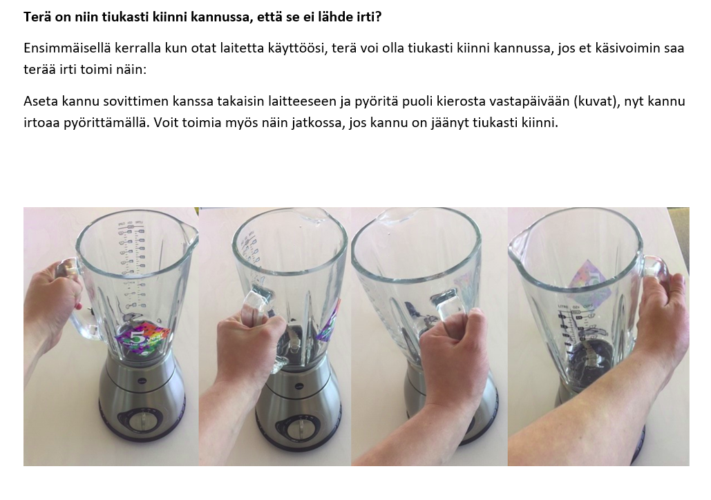 Blenderit, joissa on kiinteät terät, puhdistetaan kaatamalla kuumaa vettä ja hieman astianpesuainetta kannuun ja ajamalla blenderiä täydellä teholla. Huuhtele tämän jälkeen kuumalla vedellä. Jos jäämiä on edelleen, voit käyttää tiskiharjaa apuna.
